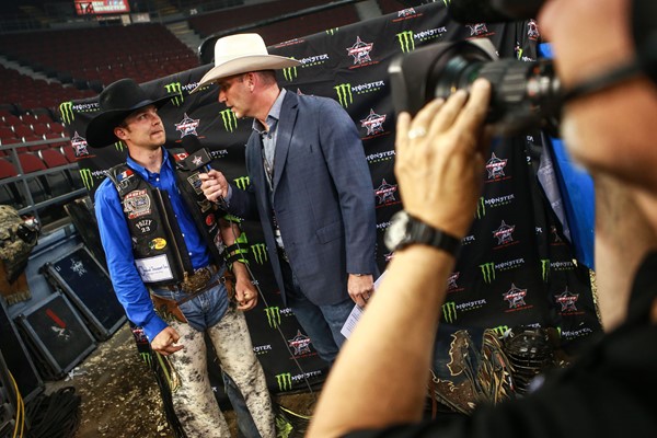 Jason Davidson (R) interviews Dakota Buttar in Ottawa, ON on the PBR Monster Energy Tour. Photo: Covy Moore / CovyMoore.com