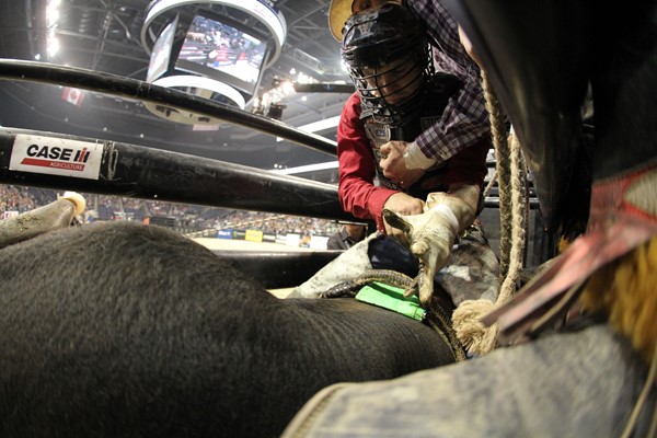 Dakota Buttar prepares to ride in Winnipeg, Manitoba on the 2016 PBR Monster Energy Tour. Photo by Covy Moore / CovyMoore.com