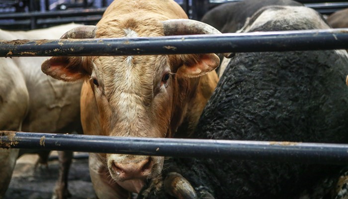 Nailed, a Canadian bull currently bucking on the elite Built Ford Tough Series, looks on from the back pens of the Monster Energy Tour’s 2016 event in Winnipeg, Manitoba. Photo by Covy Moore