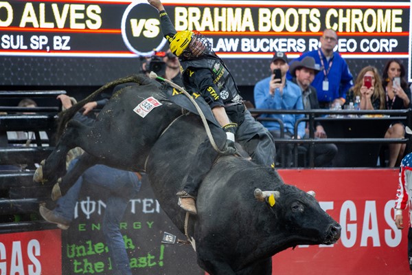 Silvano Alves attempts to ride Brahma Boots Chrome at the 25th PBR World Finals in Las Vegas at T-Mobile Arena. Photo by Matt Breneman/bullstockmedia.com