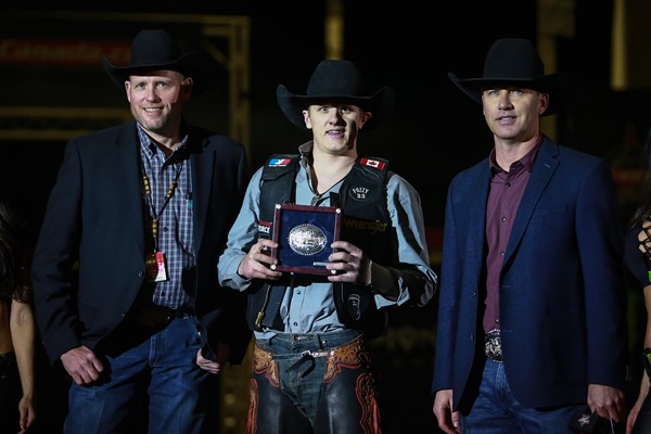 Brock Radford (centre) is presented his buckle in Calgary by PBR CEO Sean Gleason (L) and PBR Canada's Jason Davidson (R). Photo by Covy Moore / CovyMoore.com