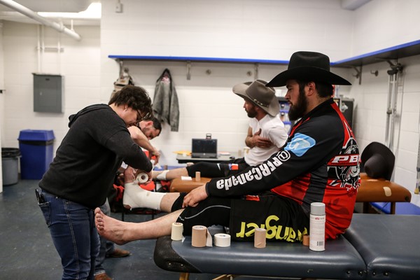 BT: Preparing for an event this year was going to be a lot different than in past years as we had to also include into it the baseline testing or retesting of concussions based on injuries at previous events. But we need to make sure that the supplies are packed and we have what we need. It is my job to make sure injuries are followed up on and if guys are getting on that they are safe to do so. If there are concussions that need to be re-tested we would have to do that as well before. Once we get to the arena it is go time to get everyone ready to ride.