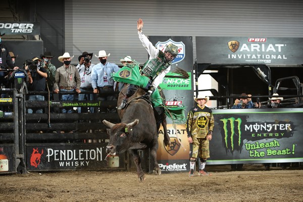 While the bull didn’t perform to his usual intensity, marked 40.75 points, the two-time PBR World Champion found his way to the buzzer in an effort that logged him 84 points.