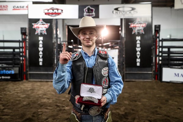 Cauy Schmidt won the PBR Canada Touring Pro Division event in mid-April in Marwayne, Alberta. Photo: Covy Moore.