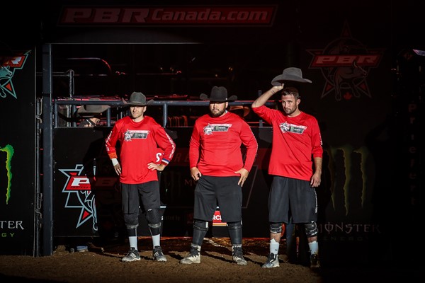 Bullfighters Brett Monea (L), Greg Loring Jr. (M) and Ty Prescott (R) have been selected to work the 2017 PBR Canada Monster Energy Tour Finals. Photo by Covy Moore / CovyMoore.com