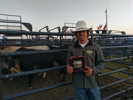 Lachlan Richardson poses with the championship buckle in Manor. Photo by Ted Stovin