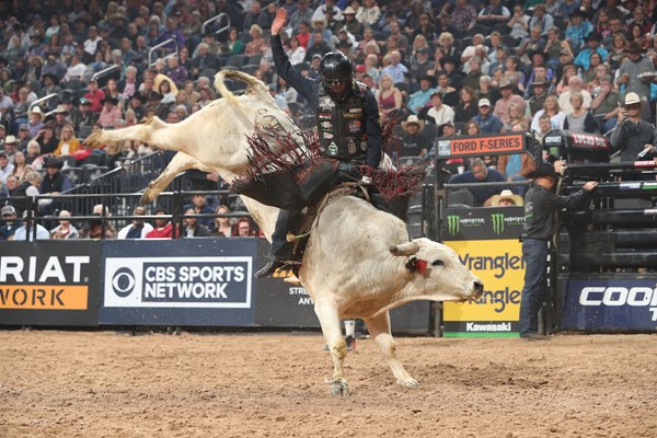 South Texas Gangster (Dakota Rodeo/Julie Rosen/Clay Struve/Chad Berger) became the first bovine athlete to buck off Leme inside T-Mobile Arena, ending his nine-out ride streak at the PBR World Finals.