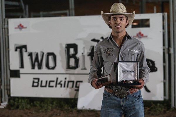 MAGRATH, Alberta – Competing at Two Bit Ranch, home of Two Bit Bucking Bulls, Lonnie West (Cadogan, Alberta) delivered a flawless 2-for-2 effort Thursday night to win the fifth annual Celebration for the Two Bit Nation, part of the PBR Canada Touring Pro Division.