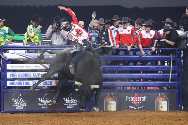 ARLINGTON, Texas – In front of a boisterous crowd inside AT&T Stadium, Team Canada concluded the first night of competition for the 2020 WinStar World Casino and Resort PBR (Professional Bull Riders) Global Cup USA, presented by Monster Energy, second, trailing leaders Team USA Eagles by 87 points.