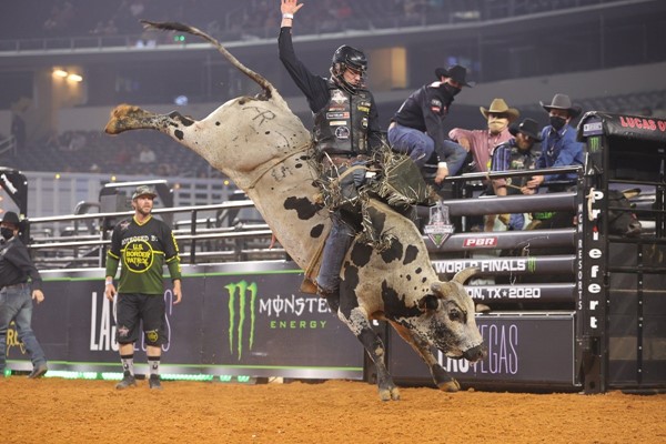 ARLINGTON, Texas – As action for the first-ever, Texas-hosted PBR (Professional Bull Riders) World Finals got underway Thursday night inside a socially-distanced AT&T Stadium in Arlington, Canadian Brock Radford (De Winton, Alberta) delivered a career-best performance to tie for fifth in Round 1 of the 2020 PBR World Finals: Unleash The Beast.