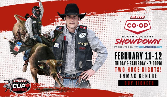 LETHBRIDGE, Alta. – For the fourth consecutive season, PBR (Professional Bull Riders) Canada’s elite Cup Series will travel to Lethbridge, Alberta, taking over ENMAX Centre on Friday, February 11 and Saturday, February 12 for the PBR South Country Co-op Showdown, presented by VisitLethbridge.com.