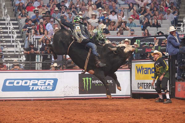 Jose Vitor Leme won Round 5 of the 2022 PBR World Finals compliments of a monster 90-point ride on Canadian bull Norse God. Photo: Andy Watson/Bull Stock Media.
