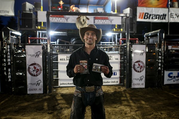 ELNORA, Alta. – Two-time PBR (Professional Bull Riders) Canada Champion Cody Coverchuk (Meadow Lake, Saskatchewan) rode supreme Saturday night in Elnora, Alberta, going a perfect 2-for-2 to win the Touring Pro Division’s Elnora Brahma Rama and inch within 34.84 points of the No. 1 rank.
