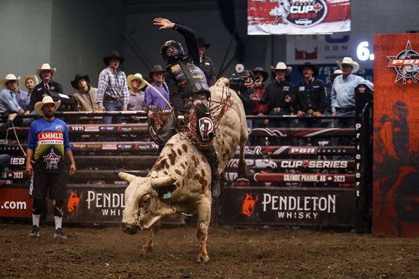 GRANDE PRAIRIE, Alta. – As the seventh PBR (Professional Bull Riders) Canada Cup Series, presented by Wrangler, event of the season got underway Saturday evening in Grande Prairie, Alberta, the race to be crowned the 2023 Canadian Champion, and earn the coveted $100,000 bonus, intensified. Coy Robbins (Camrose, Alberta) wowed the electric crowd inside Bonnetts Energy Centre, surging to an early lead at the PBR Peace Country Invitational, and winning Round 1.