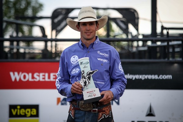 Coverchuk failed to grow his lead in the race for his record tying third national title Tuesday evening. He was bested by Built Tough (Thompson Rodeo Livestock) in 3.03 seconds.