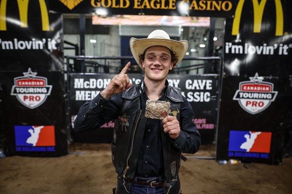 NORTH BATTLEFORD, Sask. – Nick Tetz (Calgary, Alberta) continued to ride red hot Thursday evening in North Battleford, Saskatchewan, delivering a perfect 2-for-2 performance to win the PBR (Professional Bull Riders) Canada Touring Pro Division’s McDonald’s Cold Cave Memorial PBR Classic.