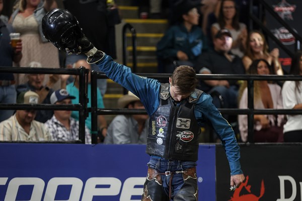 Hansen bested Young Blood (X6 Ranch Bucking Cattle/Legend Rodeo Stock) for 79 points in Round 1, before conquering Jet Black (Skori Bucking Bulls) for an event-best 87.5 points in Round 2.